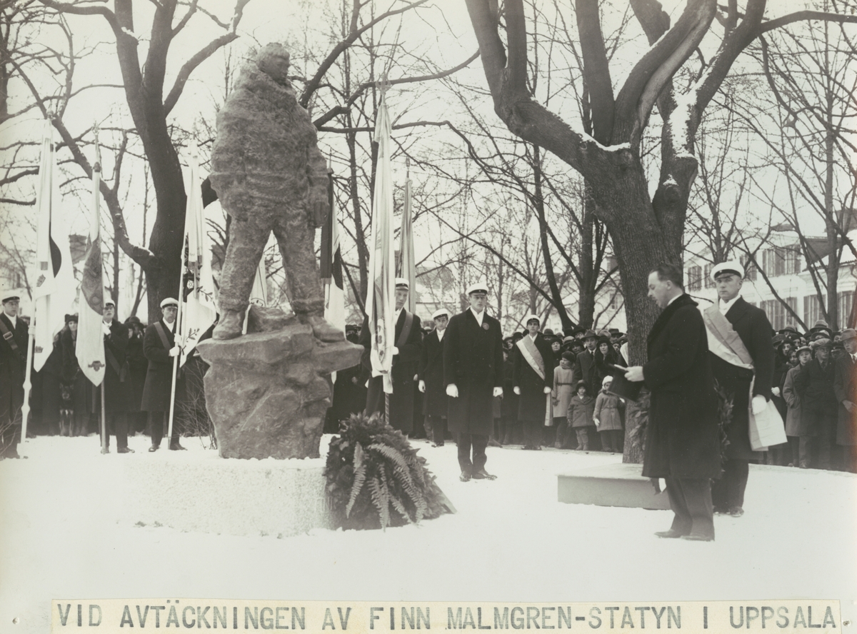 Fotografi från svenska undsättningsexpeditionen 1928. Motiv från avtäckningen av Finn Malmgrens staty i Uppsala.