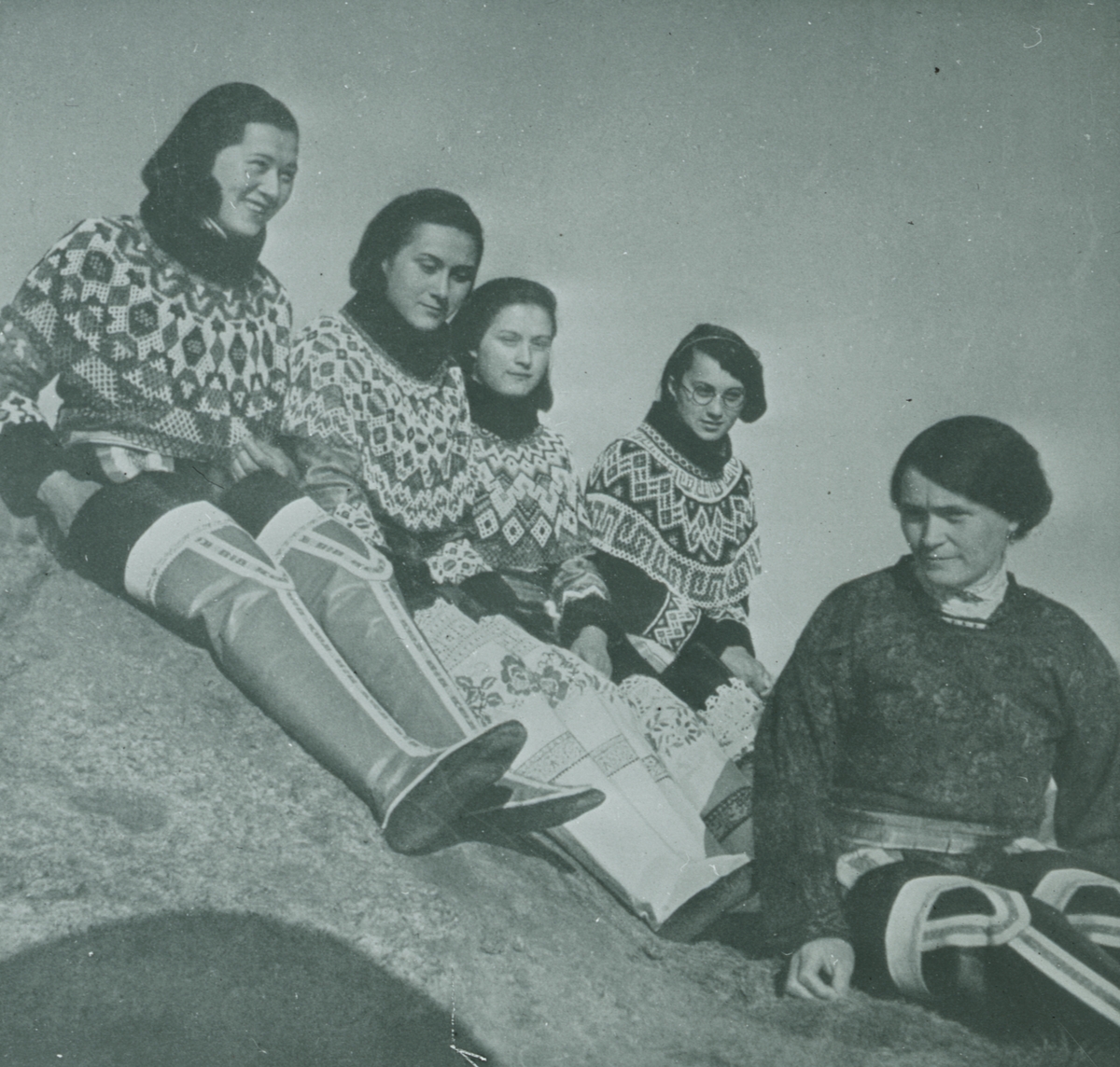 Fotografi från Grönland. Motiv av fem kvinnor som sitter på klippa.
