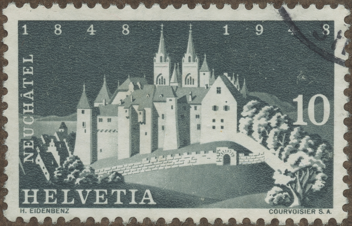 Frimärke från Schweiz, 1948. Motiv av Slottet i Neuchatel 100-årsminne av Neuchatel-revolutionen 1848-1948.