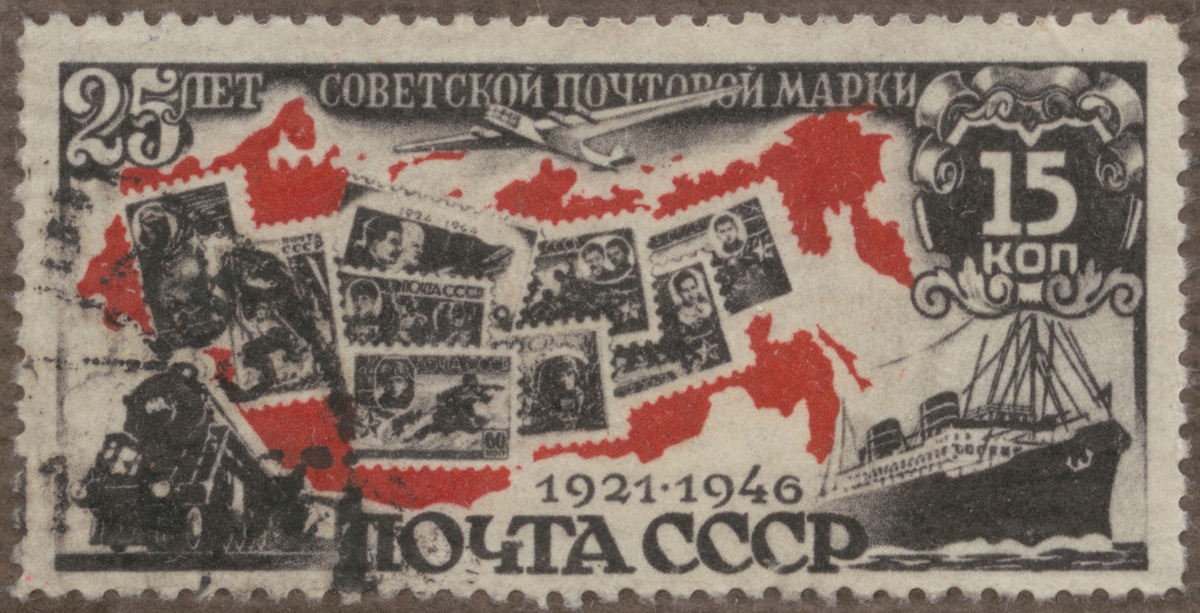 Frimärke från Ryssland, 1946. Motiv av Frimärksminiatyrer "25-årsminne av Sovjets första märken 1921-1946."