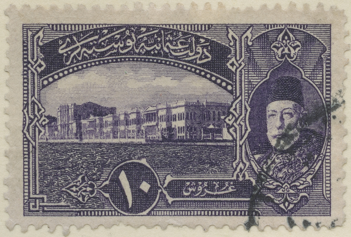 Frimärke från Turkiet, 1916. Motiv av Palatset Dolma- Bahce (t.h.): Mohammed V,-