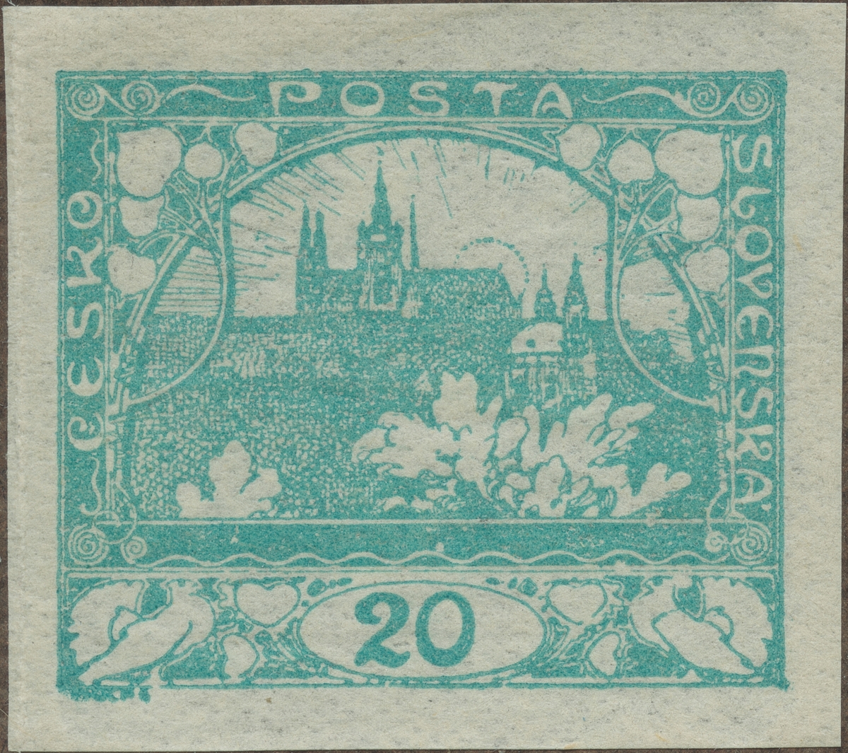 Frimärke från Tjeckoslovakien, 1918. Motiv av Pragborgen i stadsdelen Hradany i Prag