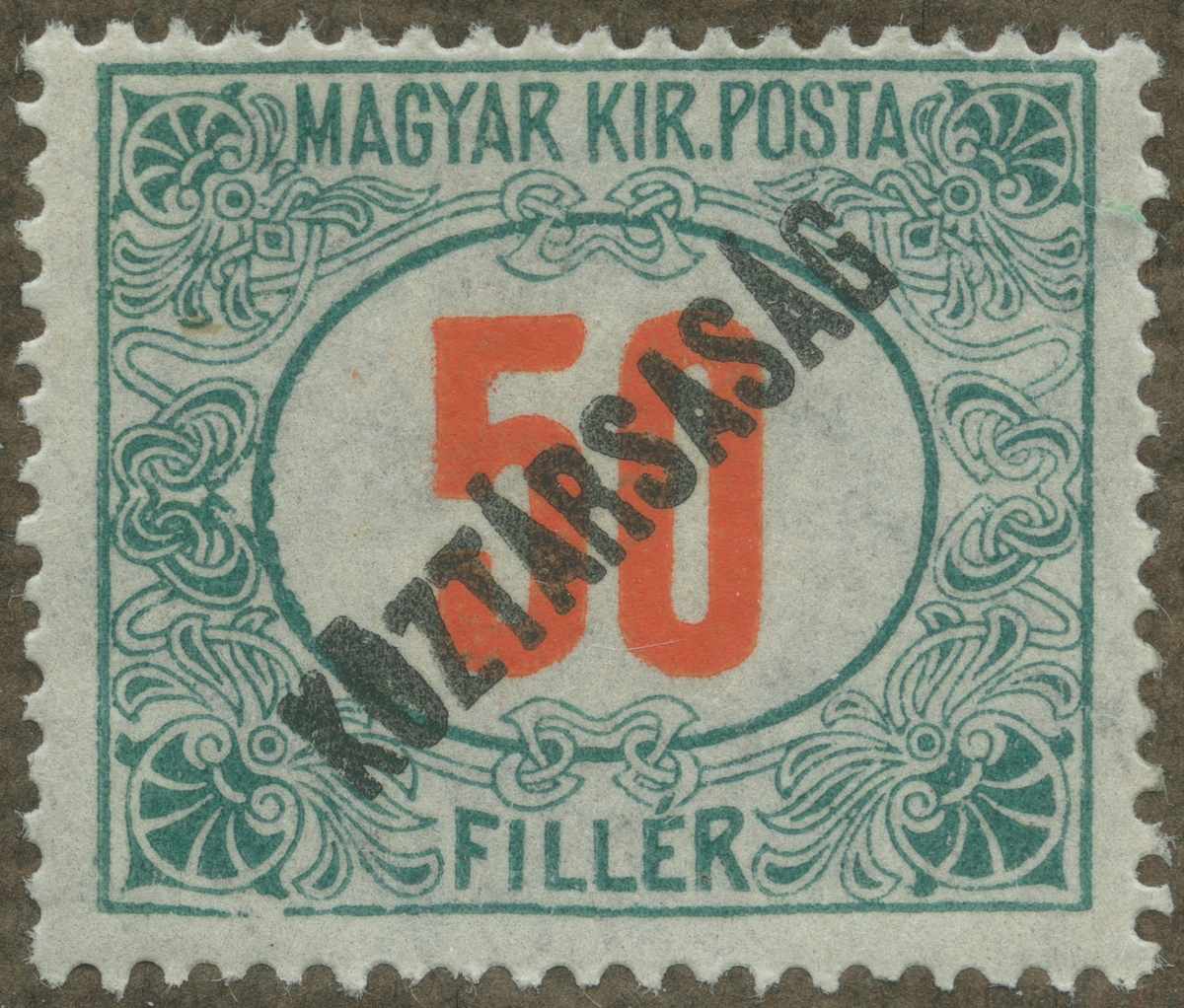 Frimärke från Ungern, 1915. Motiv av Siffror inom slingermönster. Med överstämpel: "Köztársaság", 1919. Lösen.