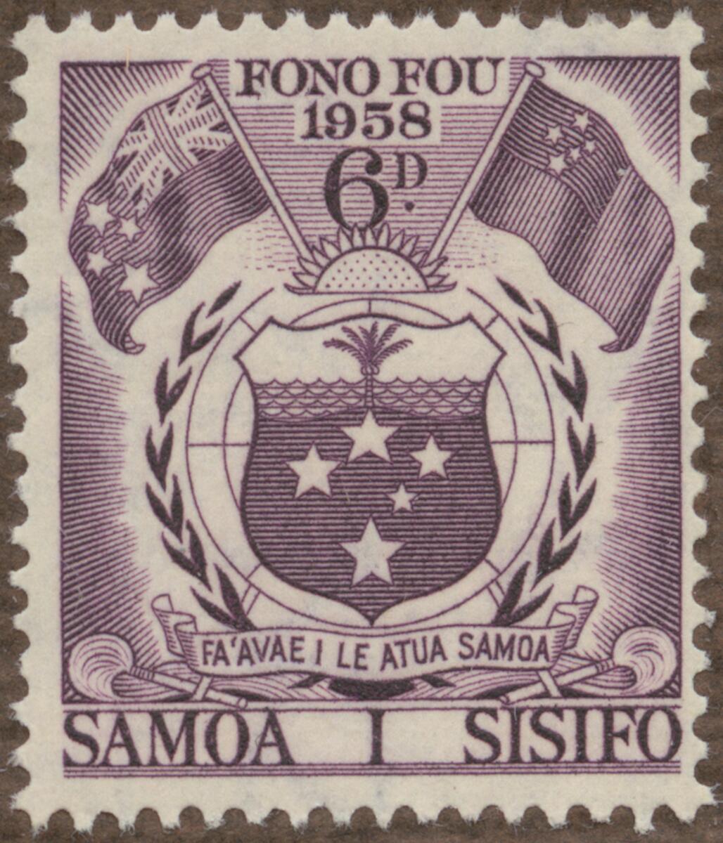 Frimärke från Samoa, 1958. Motiv av Salmoa:s Vapen (t.v. New Zealands flagga: t.h.: Samoas) Minne av Samoas första regeringssamling: 1958.