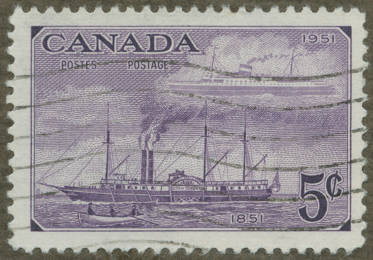 Frimärke från Canada, 1951. Motiv av "City of Toronto" hjulbåt för posttrafik 1851 samt ångfartyget "Prince George" 1951. 100-årsminne 1851-1951.