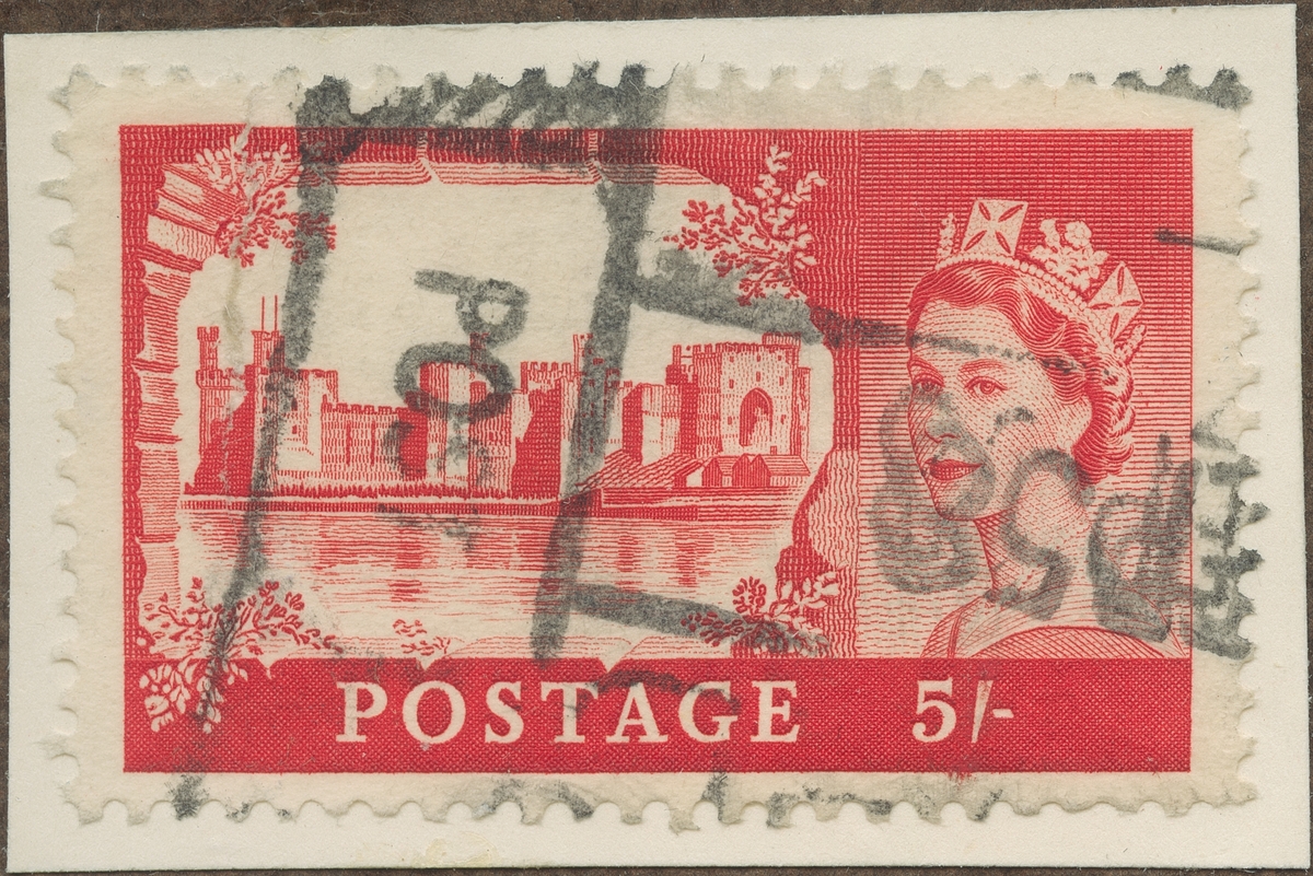 Frimärke från England, 1955. Motiv av Slottet Caernarvon i Wales (t.h.): Drottning Elizabeth II av England