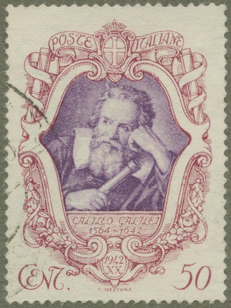 Frimärke från Italien, 1942. Motiv av Galileo Galilei 1564-1642. Matematiker, fysiker och astronom i Italien. Lagarna för pendeln. Hydrostatiska vågen. Lagarna om kroppars fall. Solsystemet med solen som centrum. "300-årsminne av hans död. 1642-1942."