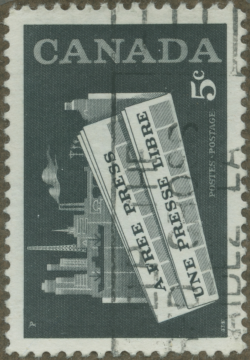 Frimärke från Canada, 1958. Motiv av Stiliserad Fabriksstad Den fria Pressen -Canadas press 50 år: 1908-1958-