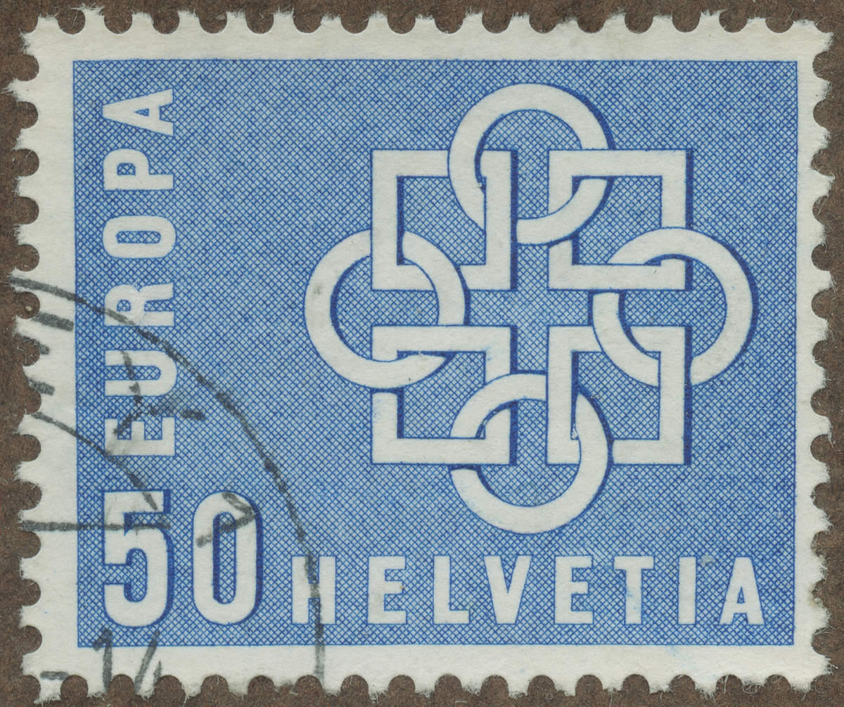 Frimärke från Schweiz, 1959. Motiv av 8 kvadrater och cirklar -Symbol för Europa-