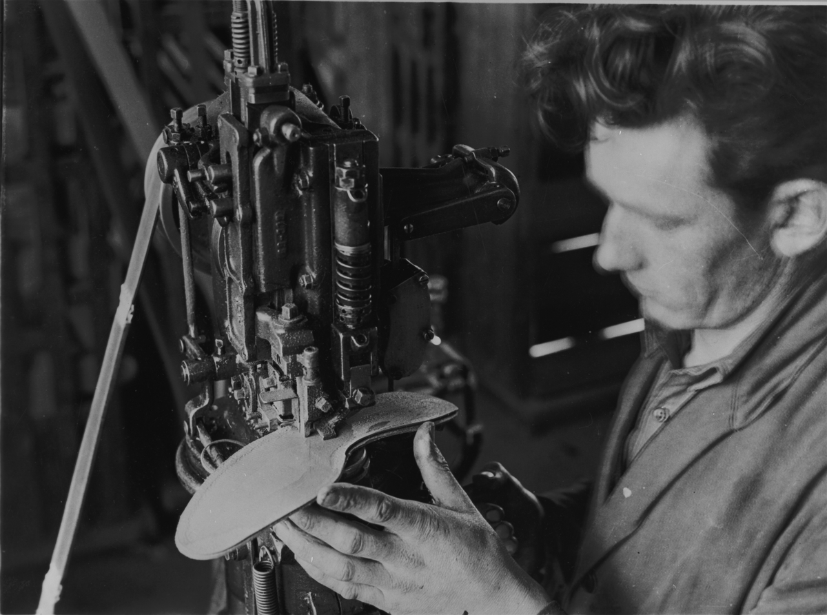 Bindsulan ritsas. Sedan ritsen därefter upprätats, bestrykes sulan med gummilösning.