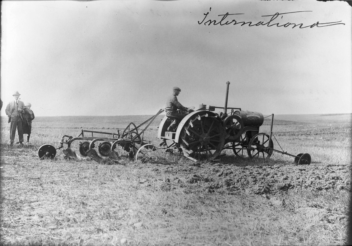 Motorplogstävling vid Hilleröd 1920. "International" försäljes av International Harvester, Köpenhamn. 20 hkr motor.3 skärig.Går alltid utan driftstörningar samt plöjer fint.