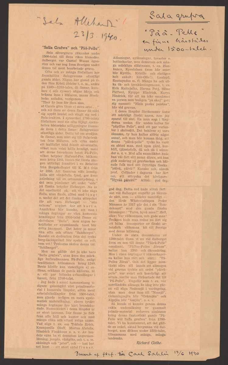 Titel: Sala gruva och silververks kronologi. Sala Silvergruva. Ur Carl Sahlins bergshistoriska samling.