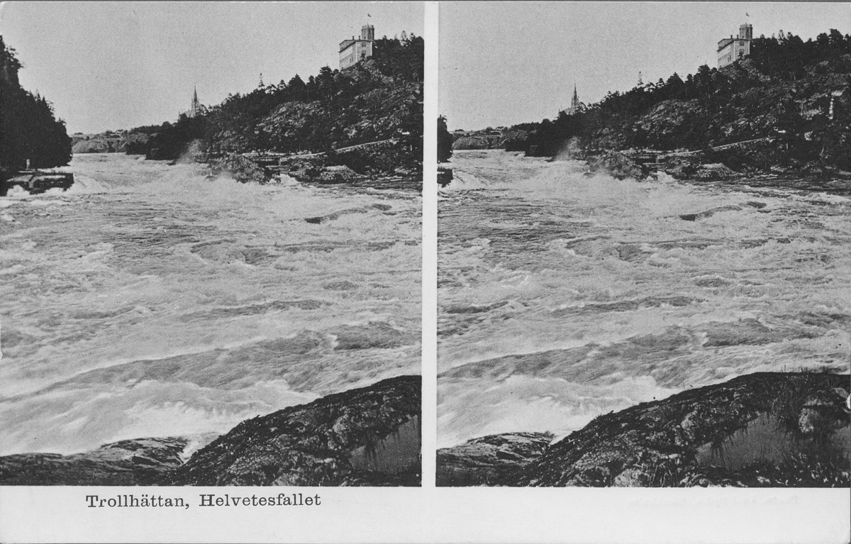 Stereobild med motiv av Helvetsefallet i Trollhättan.