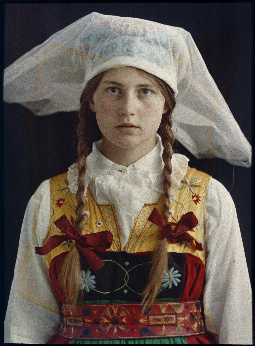 Agfa-autokrom. Serie "Margit". Porträtt av flicka i vingåkersdräkt.