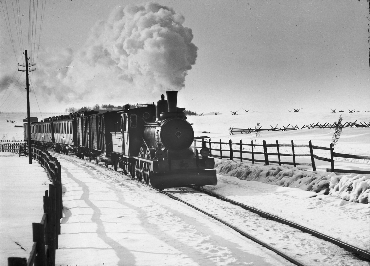 Diapositiv med motiv av lokomotiv i vinterlandskap.