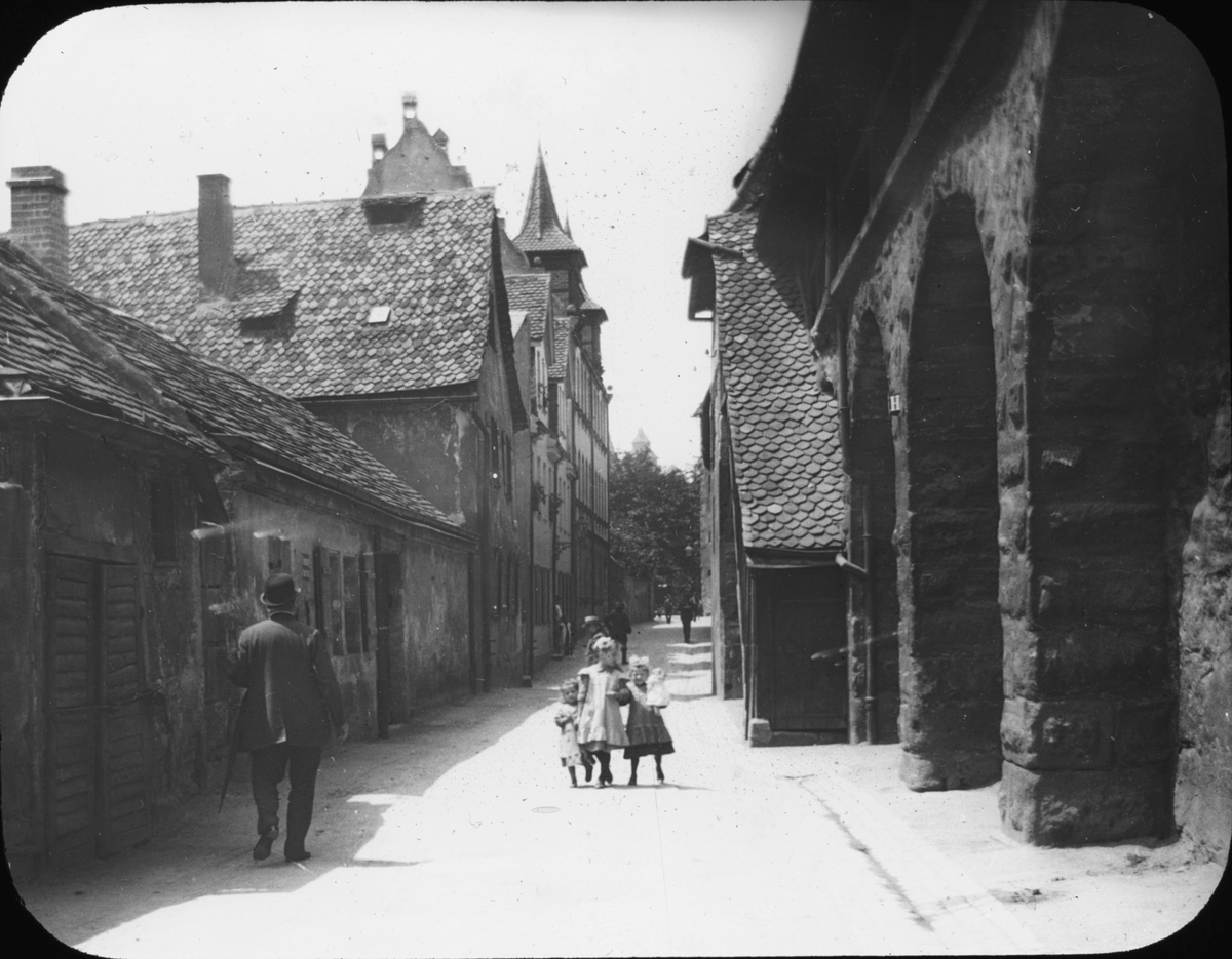 Skioptikonbild med motiv tre små flickor på gata i Nürnberg.