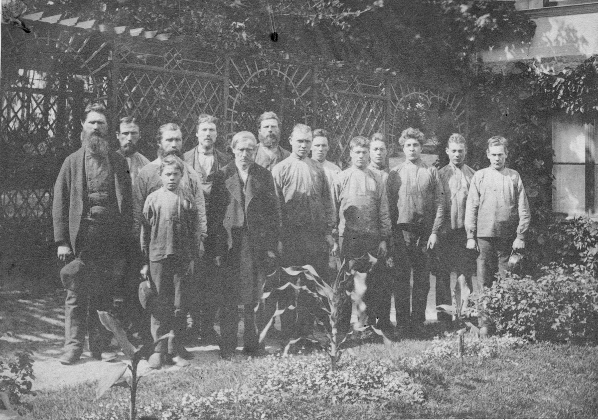 Verkstadsarbetare vid Hofors Bruk. T.v. Friman Örling, därefter P.E. Forsgren. (Se baksidan av kortet för att tyda givaren).