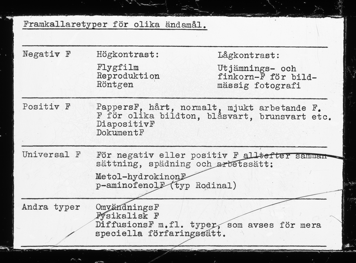 Framkallning, svärtningskurvor, olika typer av framkallare, m.m.