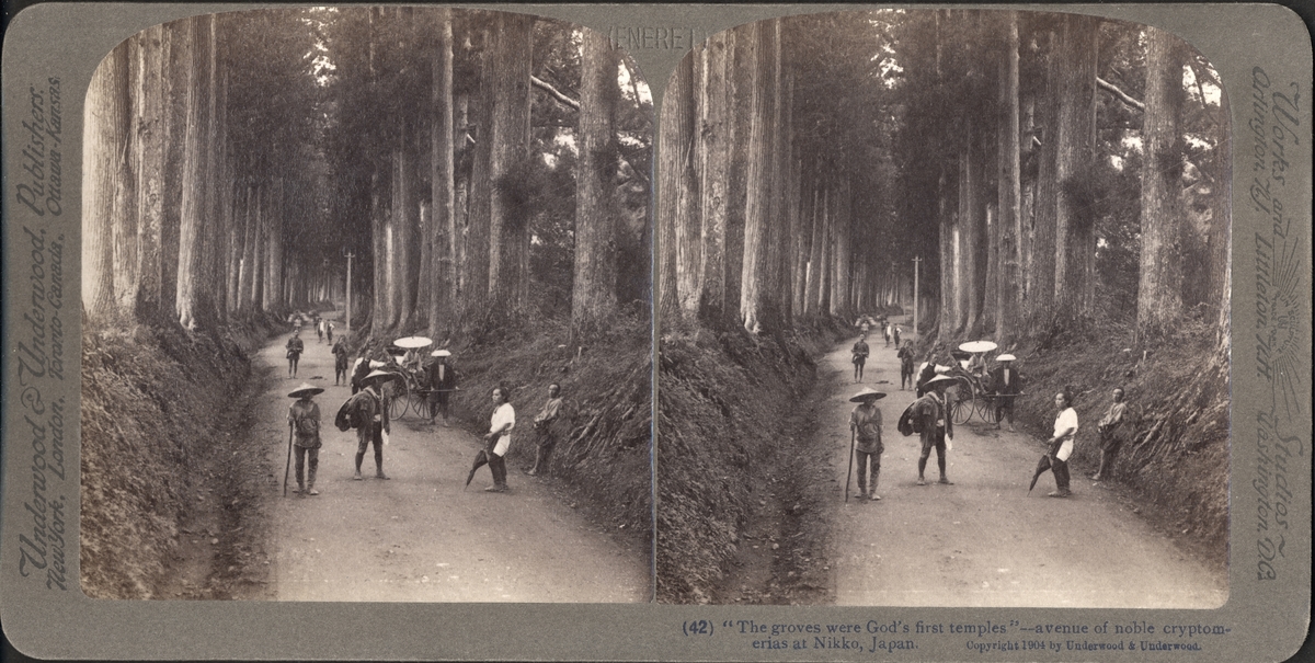 Stereobild av män på "Avenue of the noble cryptomerias", Nikko, Japan.