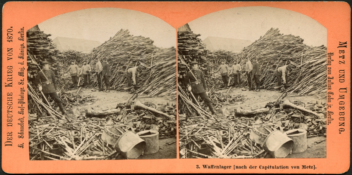 Stereobild med motiv av tre män vid vapenlager, Fransk- Tyska kriget 1870, vapenlager efter kapitulationen vid Metz.
