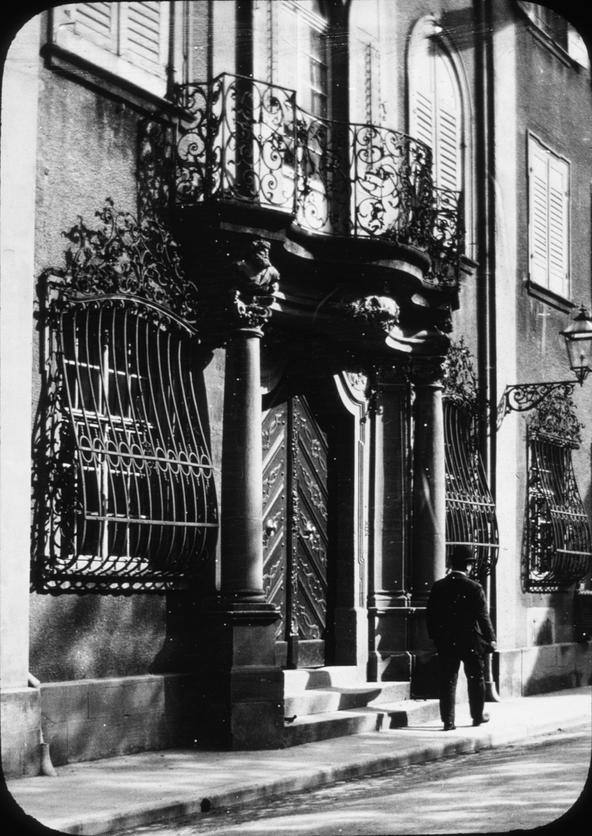 Skioptikonbild med motiv av smidda balkonger och fönstergaller, Konstanz.