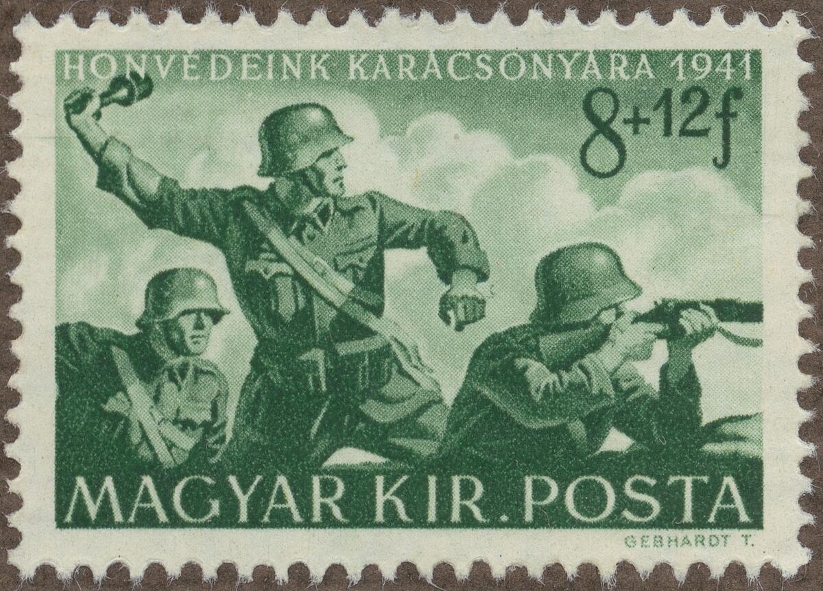 Frimärke från Ungern, 1941. Motiv av Bombkastare och infanterister -Till förmån för hären-