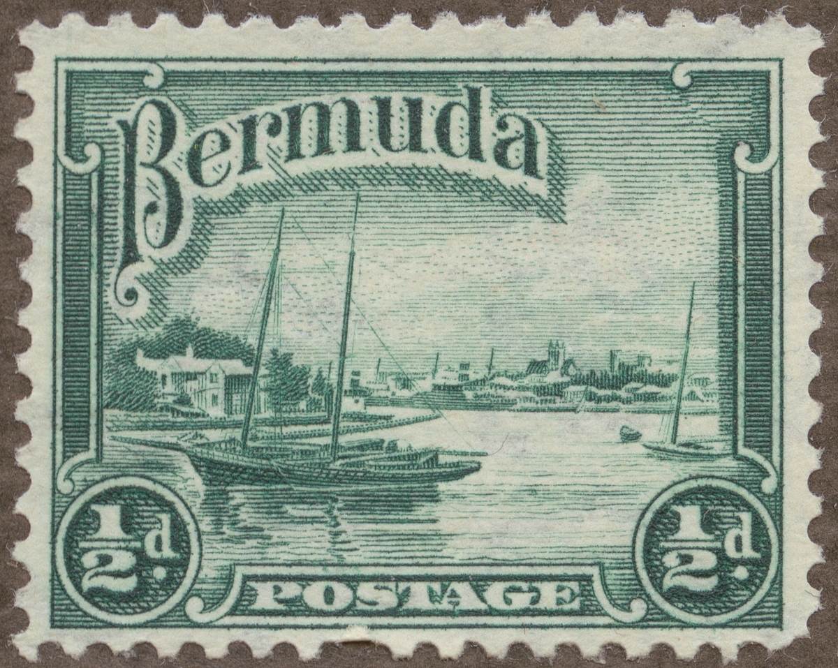 Frimärke från Bermuda, 1936. Motiv av Hamnen i Hamilton:- Mindre fiskebåt