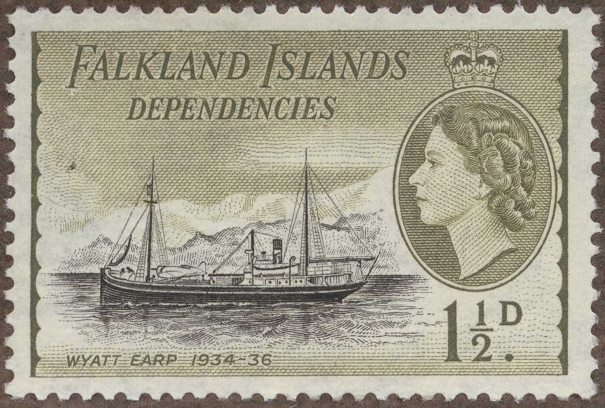 Frimärke från Falklands Öarna, 1954. Motiv av "Wyatt Earp". Sydpolarfartyg 1934-1936. Lincoln Ellsworth (U.S.A.) hade det som basfartyg för flygplansresor.