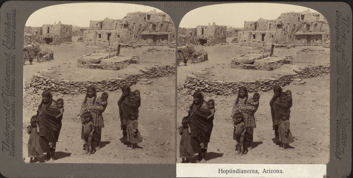 Stereobild av Hopiindianerna. Tre indiankvinnor med barn.