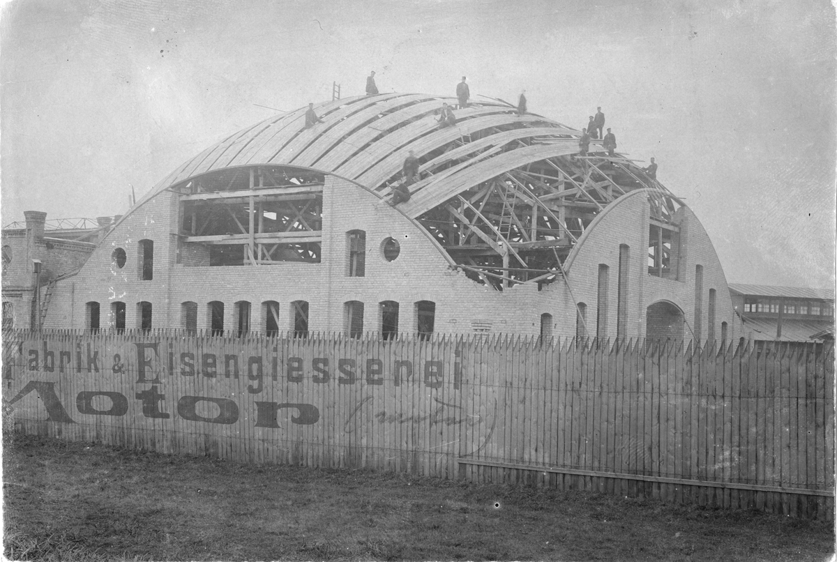 Exteriör av ett gjuteri i Riga. Taket var helt fribärande. På de takbräder som synes på fotografiet lades och spikades sedan liknande bräder vinkelrätt mot dessa.
