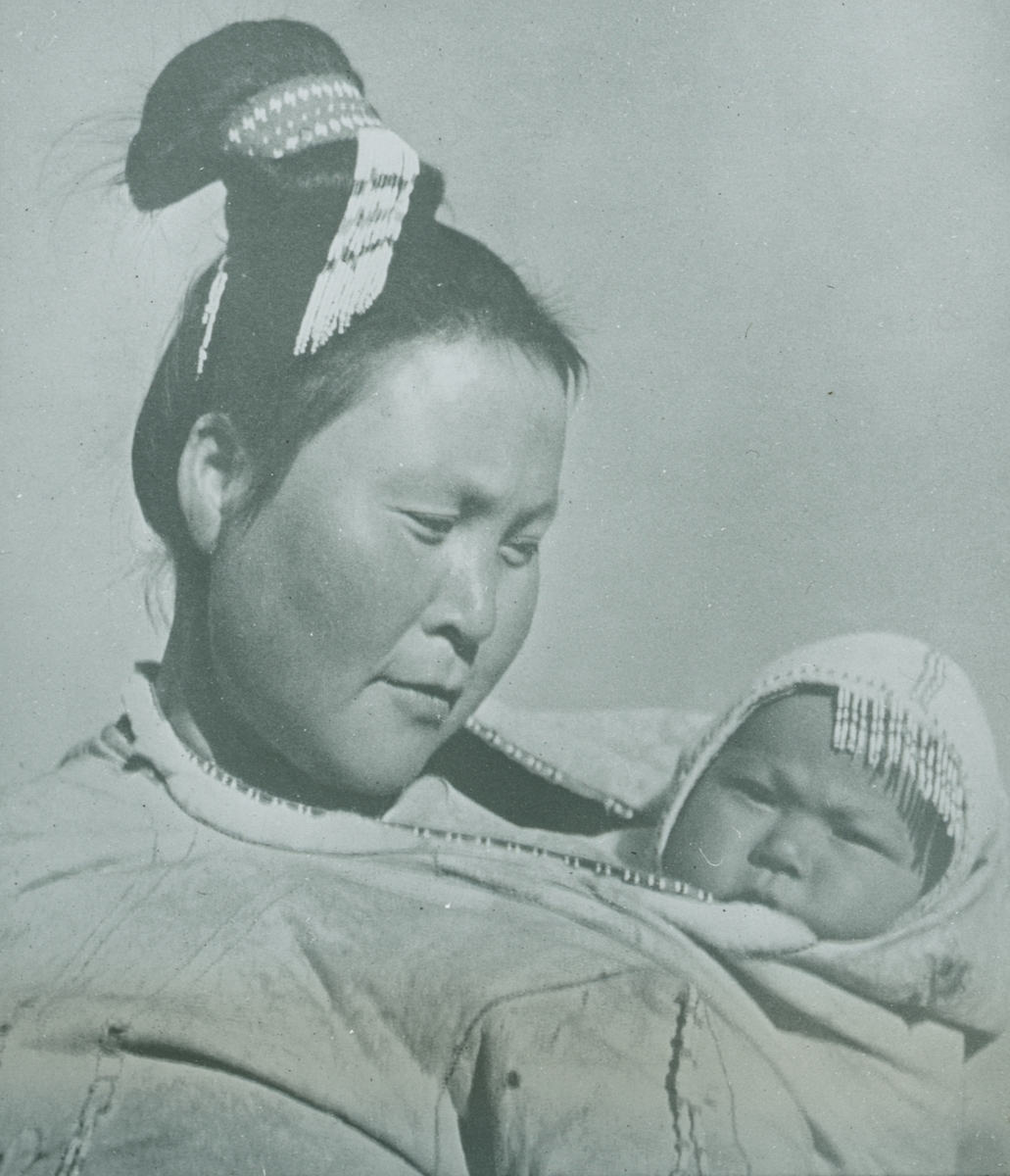 Fotografi från Grönland. Motiv av kvinna med spädbarn.