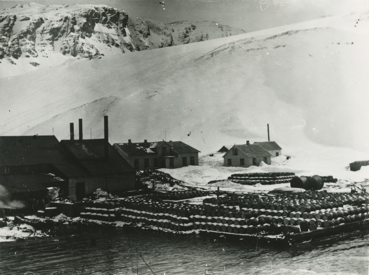 Bild från expedition i Antarktisområdet. Motiv av hamn, hus och snötäckt berg.