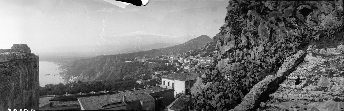 Drottning Victoria bilder. Vy från ruin, över stad ut över havet.