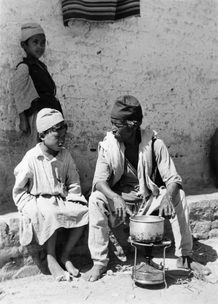 Pojke och man med fotogenkök från Optimus i Nepal 1962.