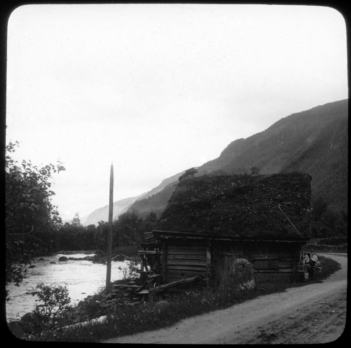 Skioptikonbild från institutionen för fotografi vid Kungliga Tekniska Högskolan. Motiv föreställande en kvarn med vattenhjul. Bilden är troligen tagen av John Hertzberg under en resa i Europa.