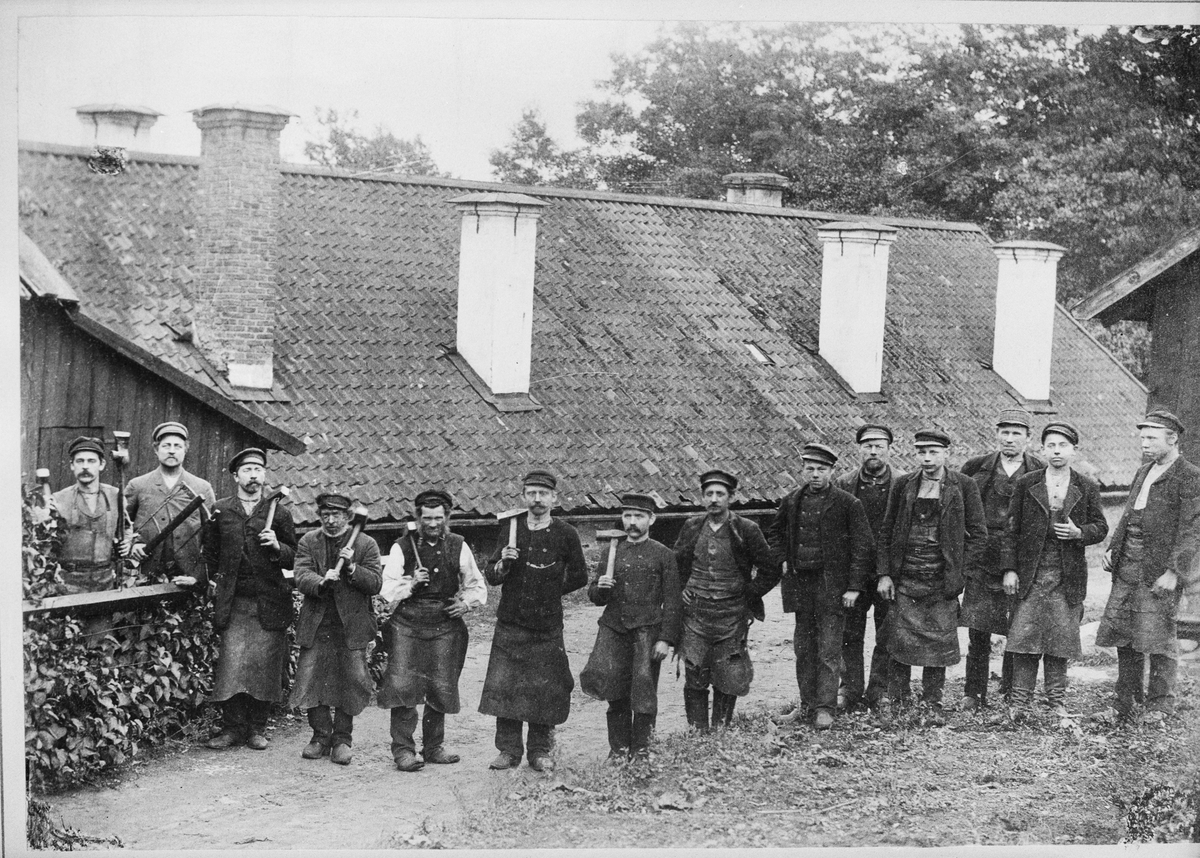 Smeder vid Wira Bruk. Foto troligen från 1894. Originalet tillhör smeden John Dahlgren, Wira Bruk. >>