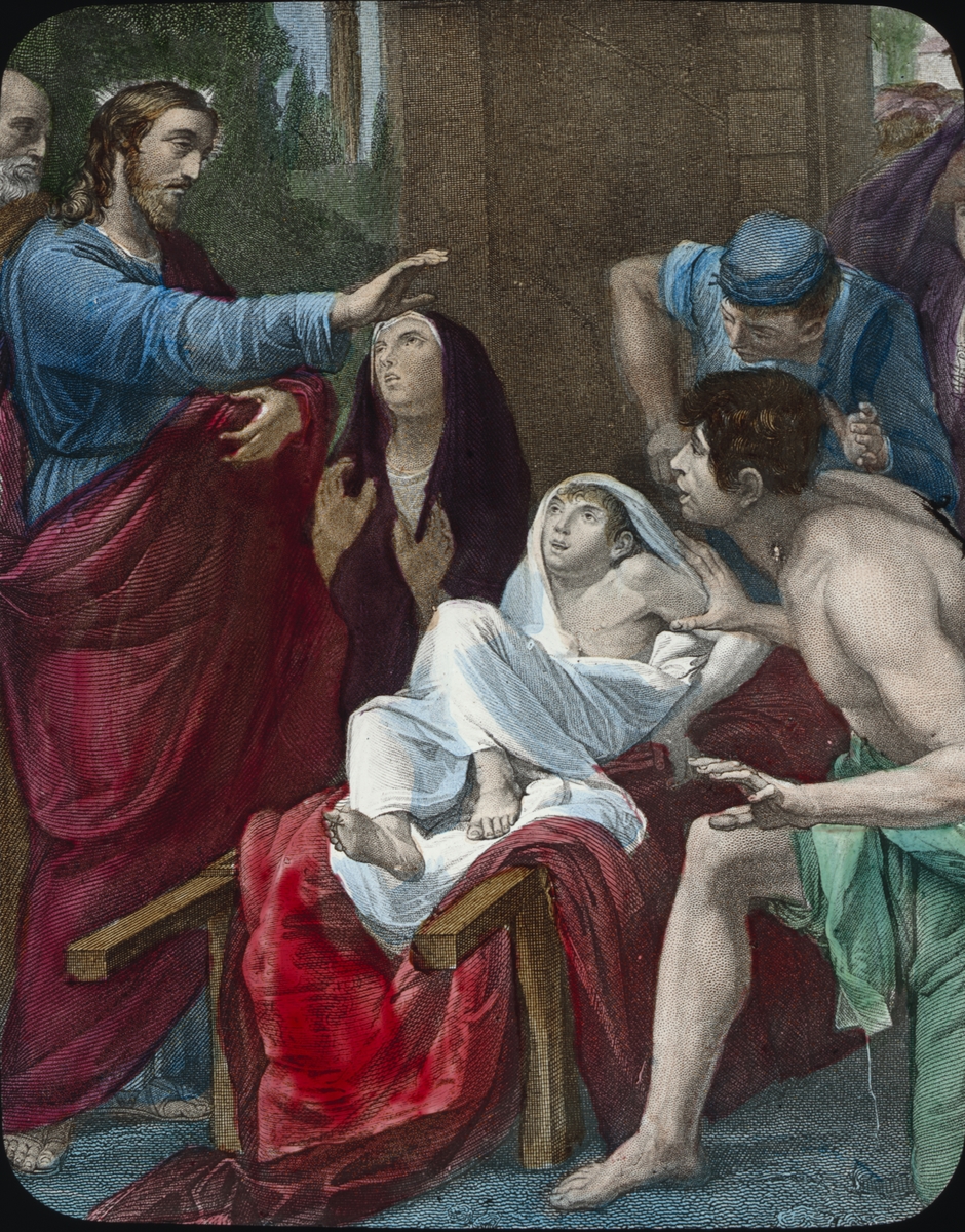 Kolorerad skioptikonbild med religiöst tema. Jesus välsignar den sjuka.