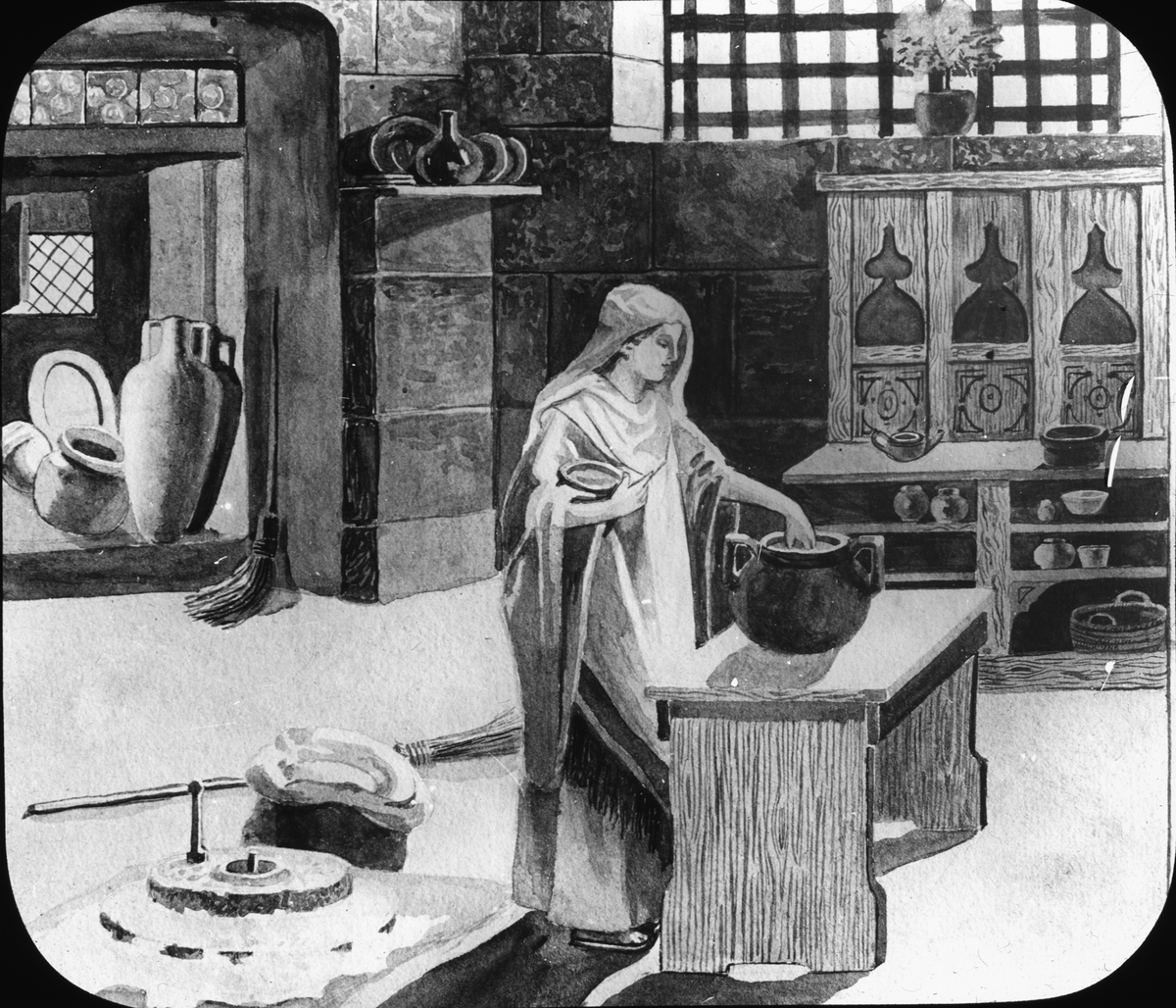 Skioptikonbild. Trykt bild. Kvinna i kök?