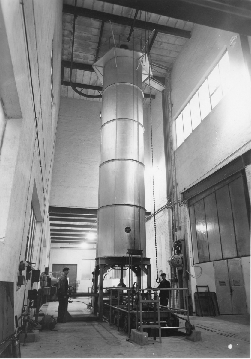 255 kw cylindrisk vertikal ugn för härdning, normalisering etc. av rör och rörmanufaktur. Värmeelementen är uppdelade i 6 individuellt reglerade zoner. Chargen skyddas mot oxidering avkolning etc. i ugnsrummet av vätehaltigt kväve. Temperatur max 950 grader. Leverantör till Sandvikens Jenverk, AB Elektrougnar, Stockholm. Fotot taget i samband med Svenska Mässan 1944.