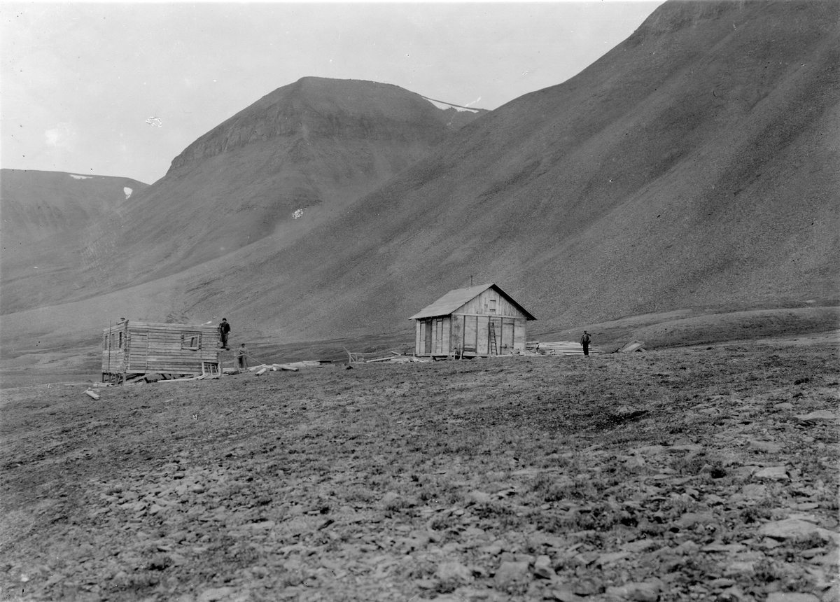 Sveagruva. Två av gruvans första byggnader. Sjukstugan och kontoret, 1917.