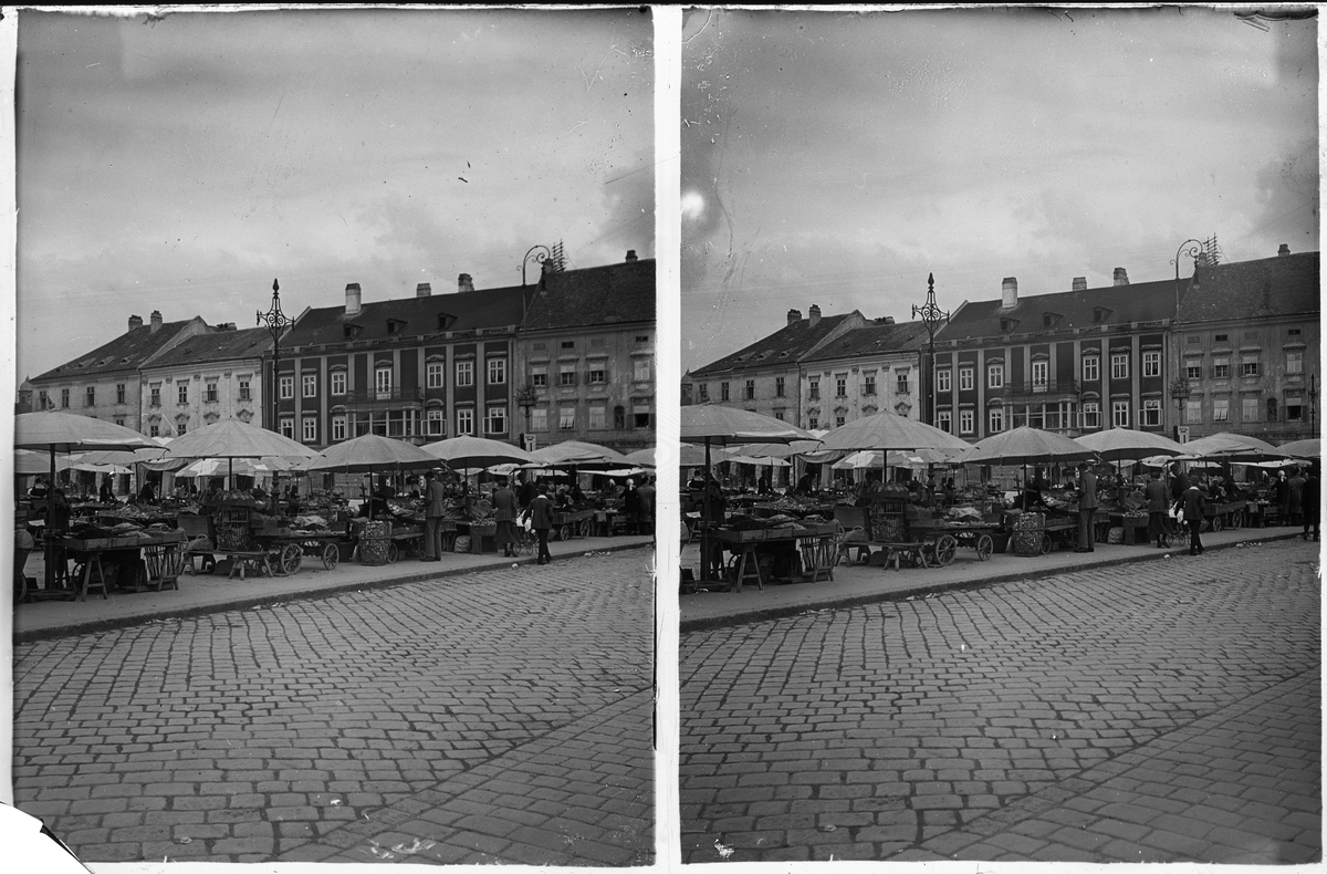 Stereonegativ med motiv av torghandel. Okänt torg. Möjligen Tyskland.