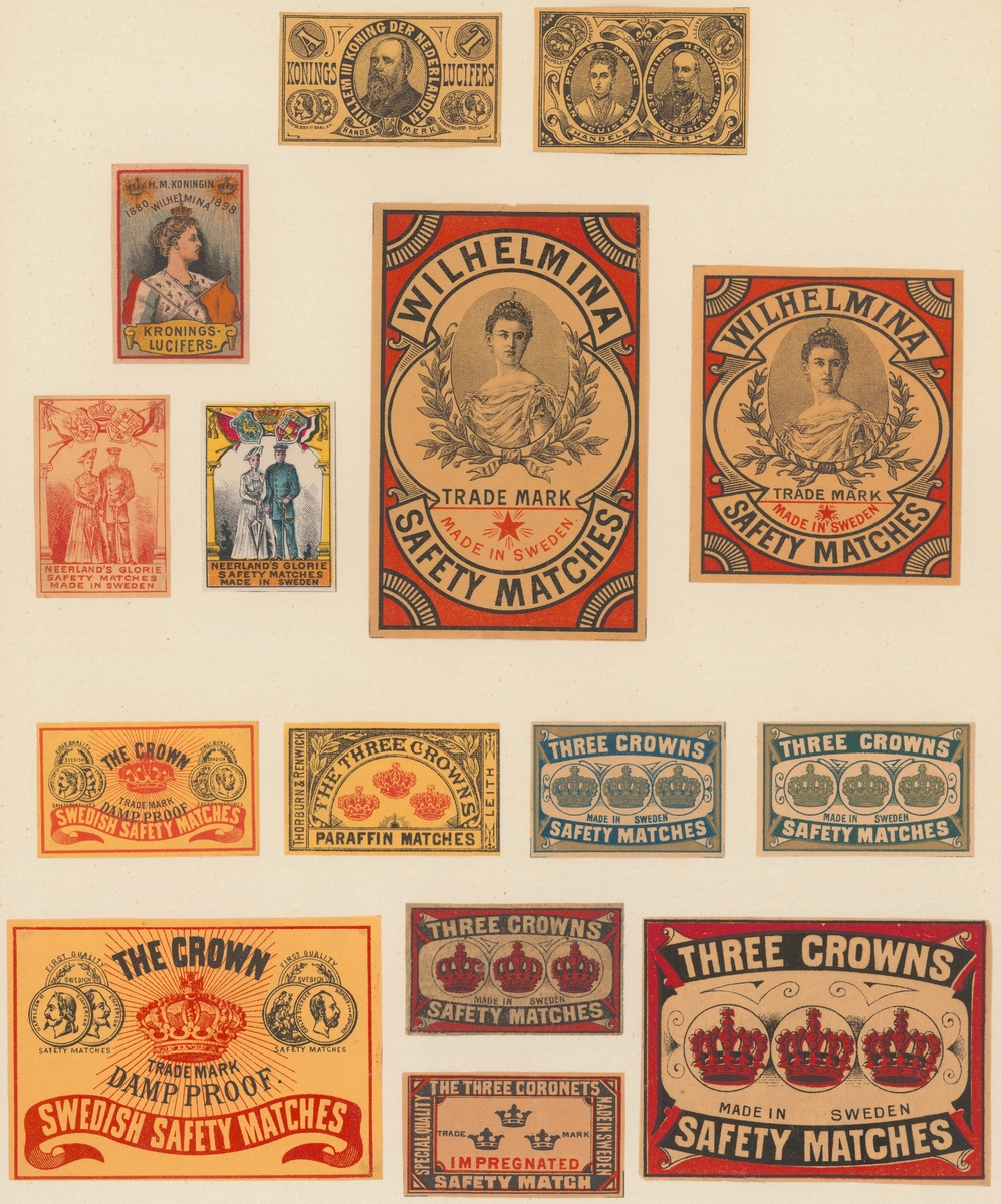 Etiketter för tändsticksaskar, från Svenskt Industri- och Handelsmuseum.