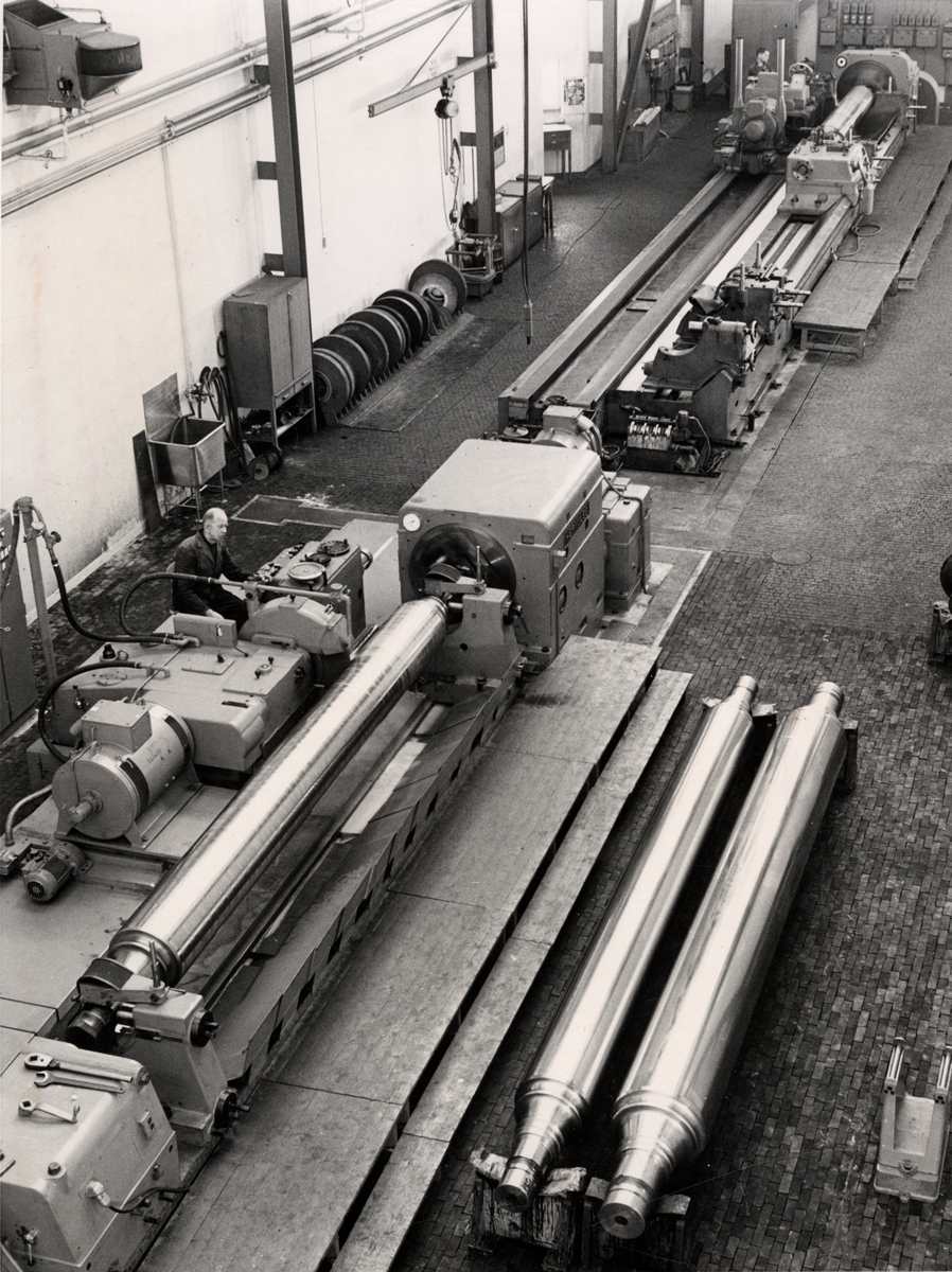 Slipning av kalandervalsar i hall med automatisk temperaturreglering för undvikande av måttavvikelser hos de stora arbetsstyckena.