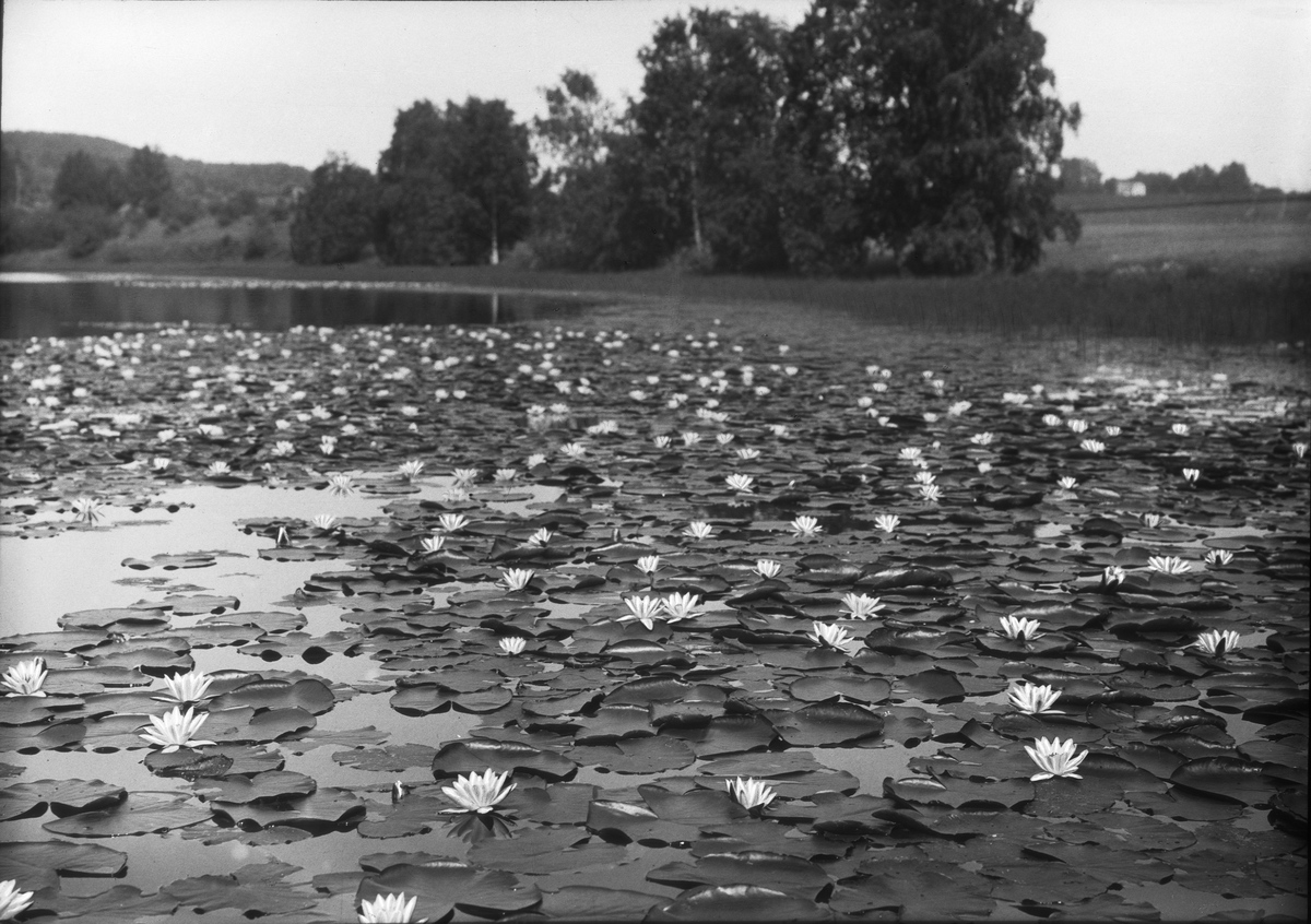 Diapostiv, fönsterbild med sommarmotiv. Näckrosor vid stranden.