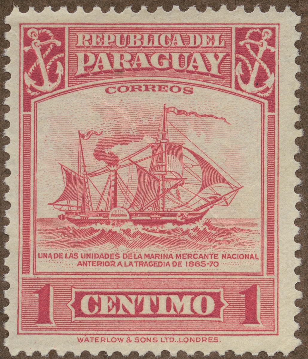 Frimärke från Paraguay, 1944. Motiv av Hjulångare med segelställ