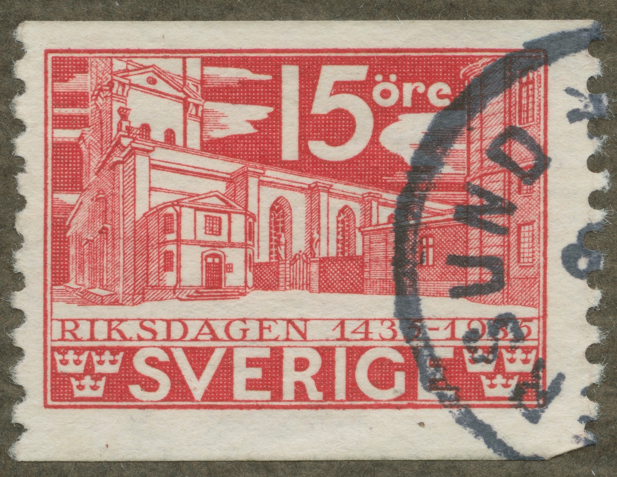 Frimärke från Sverige, 1935. Motiv av Storkyrkan i Stockholm. "Den svenska riksdagen 500 år 1435-1935".