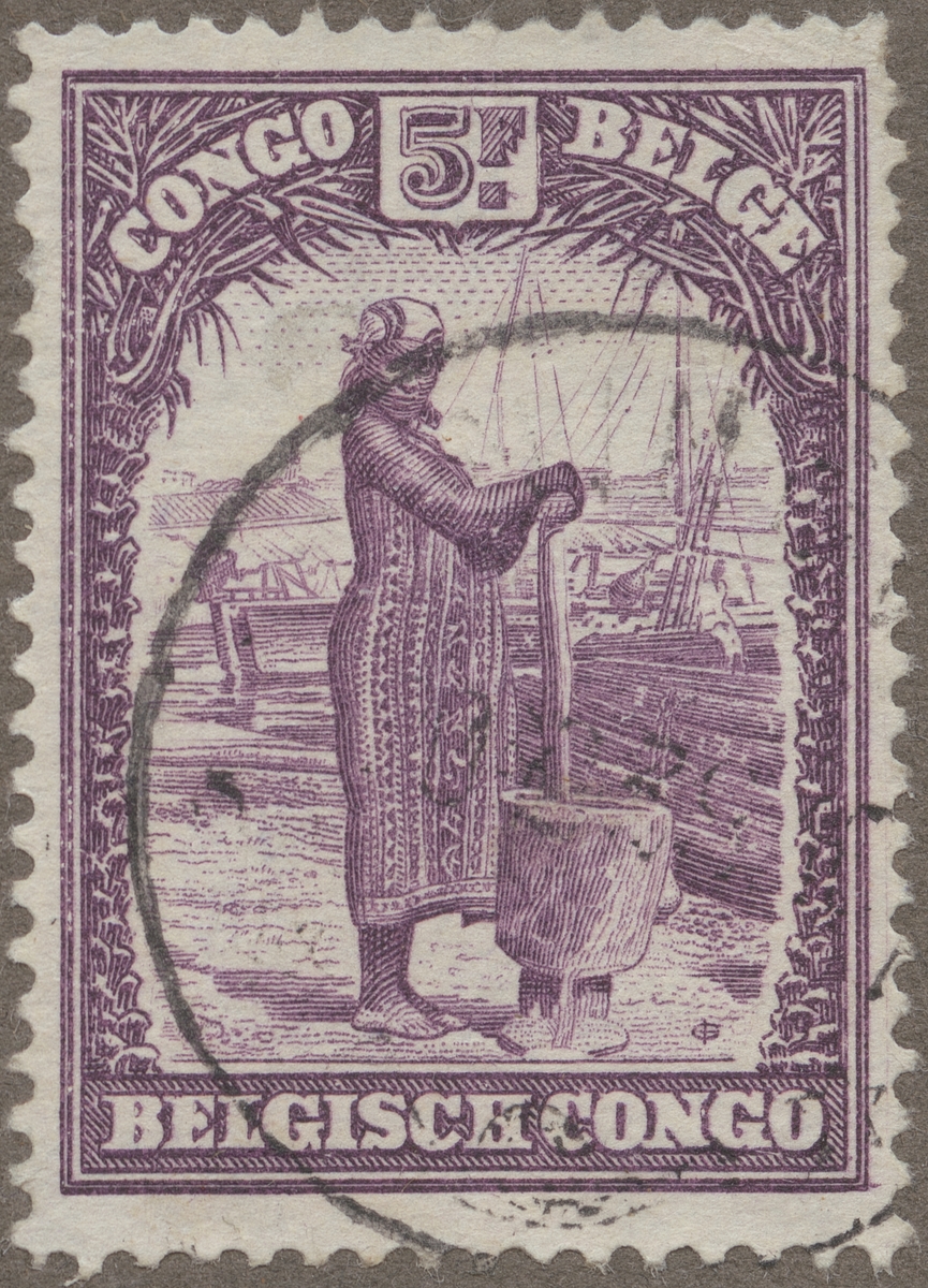 Frimärke från Belgiska Congo, 1931. Motiv av pulvrisering av arrowrotknölar för framställning av maniokastärkelser eller kassavamjöl eller tapioka.