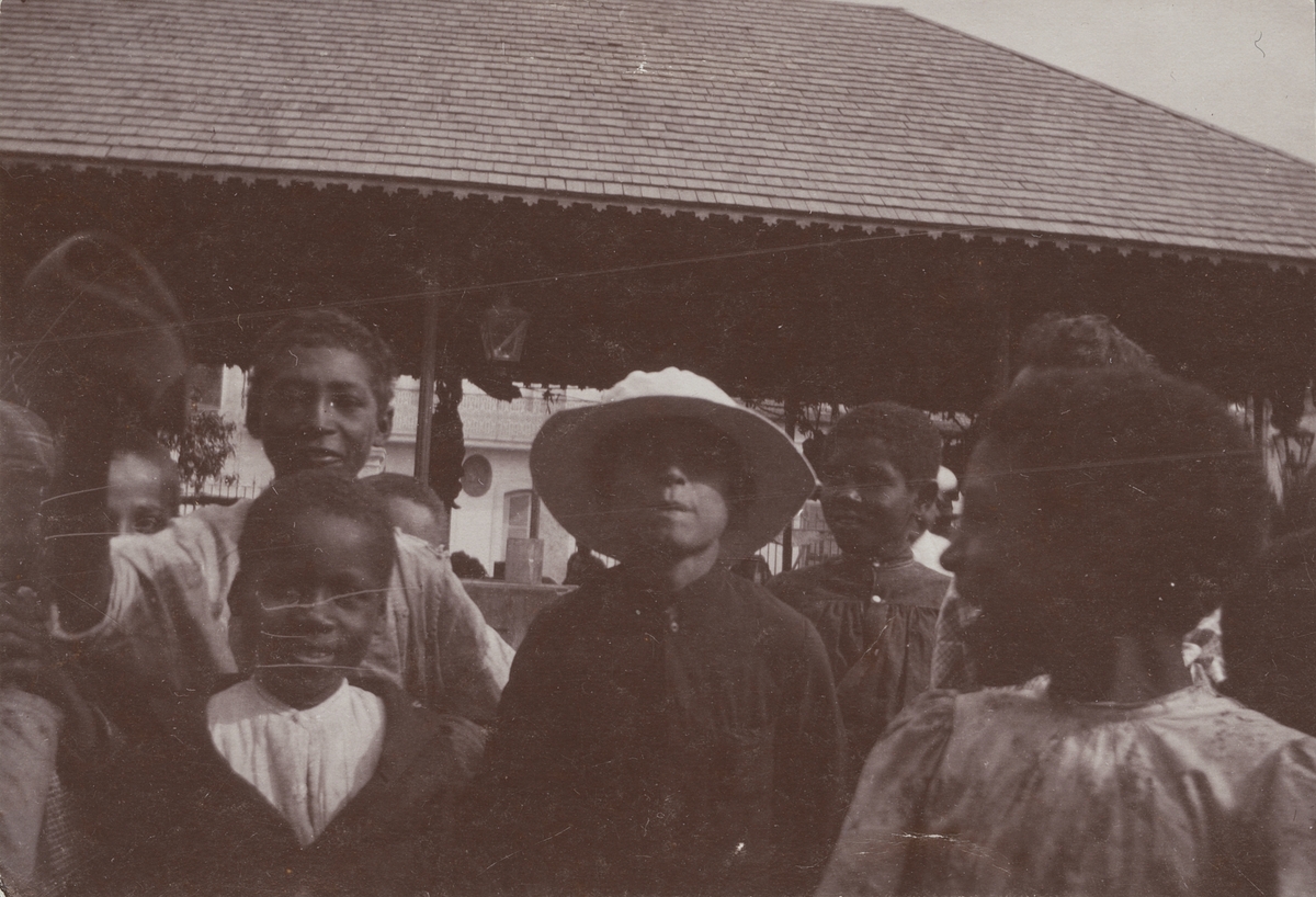 Fotografi från första svenska Antarktisexpeditionen 1901-1904. Närbild av ett antal barn nära ett tak.