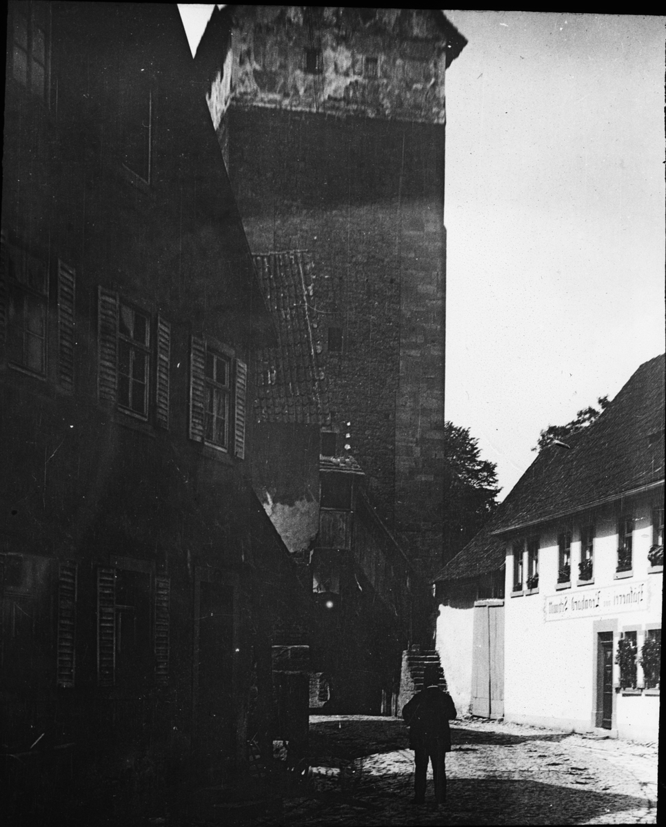 Skioptikonbild med motiv av man vid stadmurstorn i Münnerstadt.