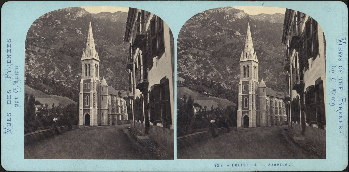 Stereobild av kyrka i Saveour, Pyreneérna.